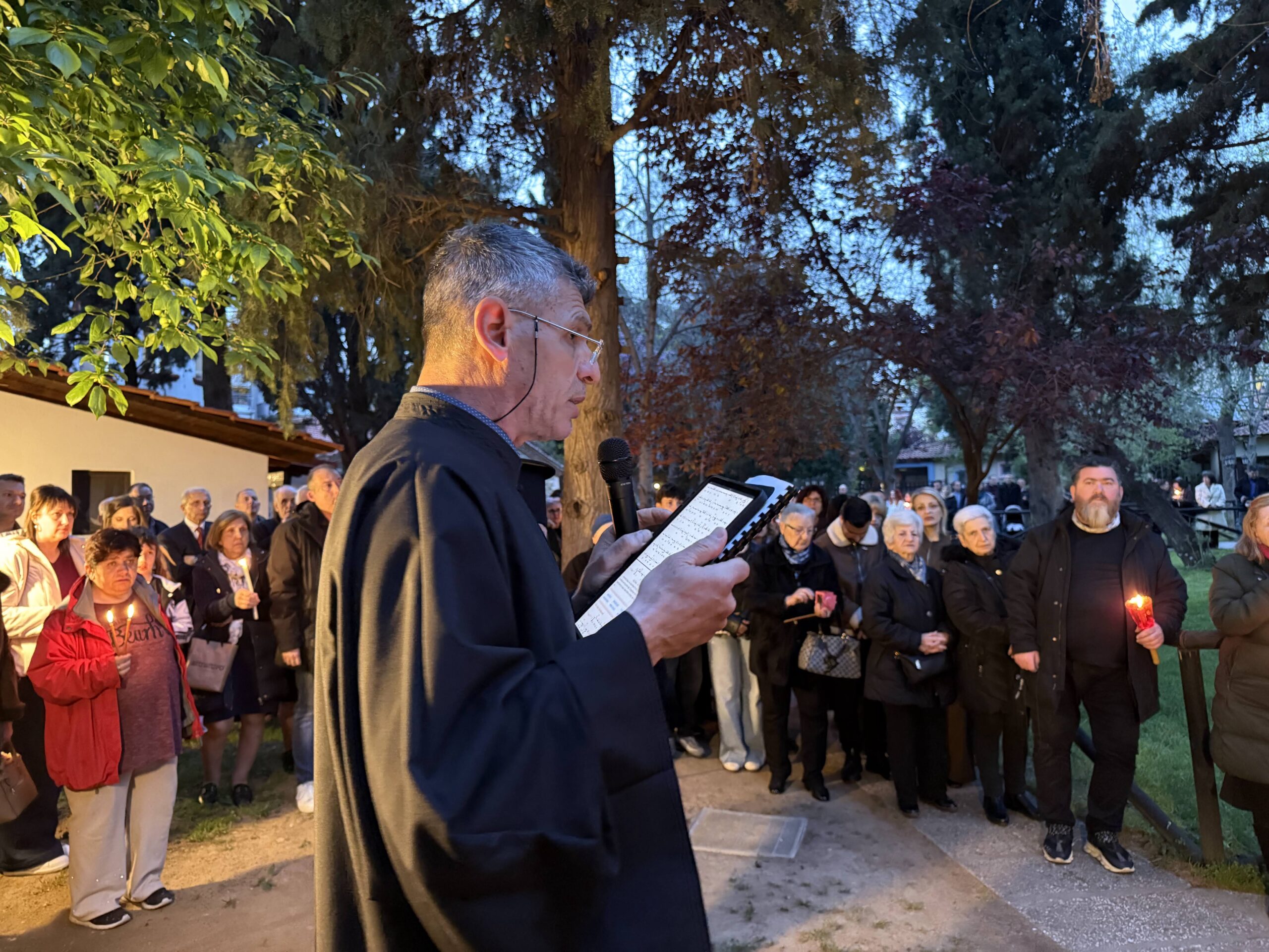 Στη συνέχεια η Ακολουθία ολοκληρώθηκε μπροστά στο Παρεκκλήσιο των Αρχαγγέλων στην Αυλή του Αγίου Αθανασίου, όπου βρίσκεται και το Οστεοφυλάκιο, ώστε να μεταφέρουμε και στους Κεκοιμημένους αδερφούς μας το χαρμόσυνο μήνυμα της Ανάστασης!